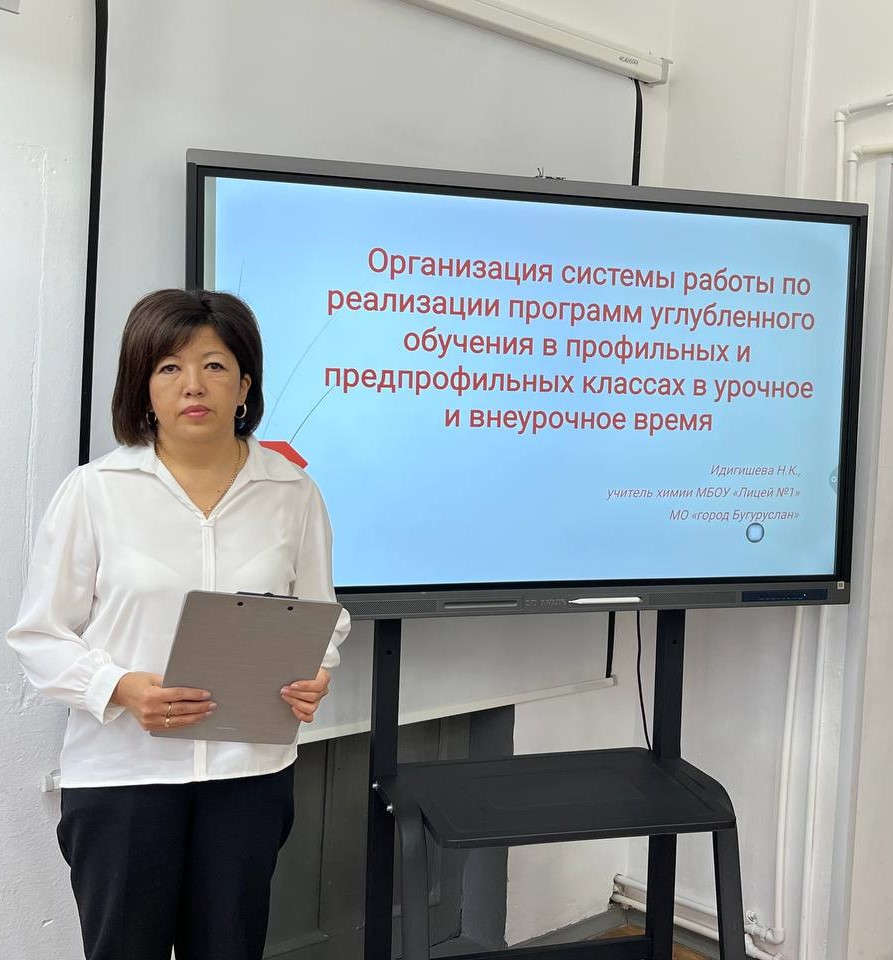 Идигишева Н.К., руководитель ГМО учителей химии, поделилась с коллегами опытом реализации естественно-научного профиля на базе лицея, отметила эффективность введения пропедевтического курса химии в 7 классах для более качественной подготовки учащихся. Убедительные результаты работы профильного образования подтверждаются качеством подготовки к ЕГЭ и ОГЭ по химии и биологии, активностью участия лицеистов в научно-практических конференциях, олимпиадном движении.