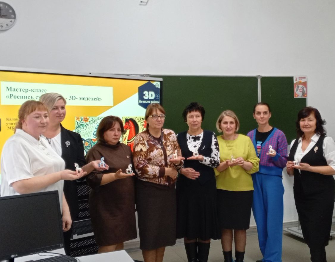Калашникова А. А., учитель труда (технологии) МБОУ СОШ №2, поделилась опытом реализации модуля «3D-моделирование, прототипирование и макетирование» в 7-9 классах посредством программ компьютерной графики и последующей визуализацией объектов с помощью 3D- принтера; провела мастер-класс «Роспись сувениров - 3D моделей».
